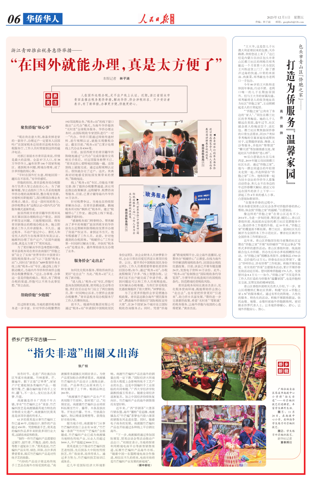 12月1日,人民日报海外版第6版刊发《“指尖非遗”出圈又出海》一文,介绍广西壮族自治区岑溪市南渡镇传承竹芒编织非遗技艺,发展竹芒编织产业,产品远销海内外,促进村民就业增收。