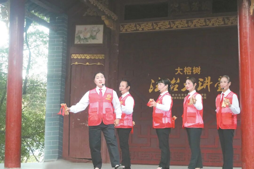 ▲平乐县张家镇榕津村由“法律明白人”组成的“大嫂子”法治宣传队,运用“法治三句半”进行法治宣传。自治区司法厅 供图