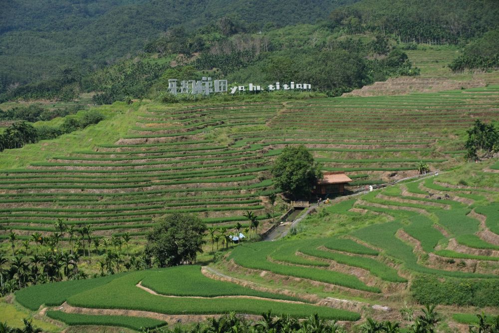 ↑10月2日,五指山市毛阳镇牙胡村,层层梯田依山铺展,绿浪涌动。新华社记者 李玥 摄